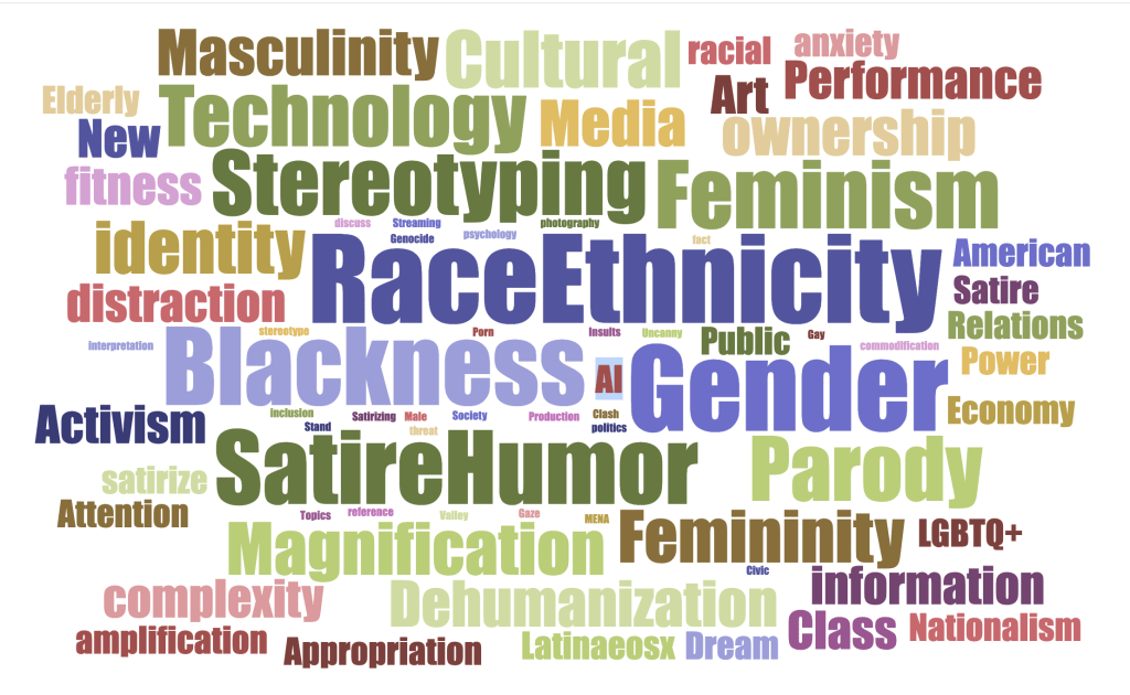 Activism Advertising American Dream Appropriation Art Attention Economy Blackface Celebrity Culture Civic Society Cultural Ownership Culture Clash Elderly Gay Porn Gender Gender Femininity Gender Feminism Gender Male Gaze Gender Masculinity History Identity Insults LGBTQ+ Memory Musical Guest Nationalism Performance Politics Power Public Relations Race Race/Ethnicity: Latin/a/e/o/s/x Race/Ethnicity Blackness Race/Ethnicity MENA Race/Ethnicity Whiteness Satire/Humor Impressions Satire/Humor Magnification Satire/Humor Parody Socioeconomic Class Stand Up Stereotyping Counterhegemony Stereotyping Dehumanization Technology AI Technology New Media Technology Streaming Technology Uncanny Valley